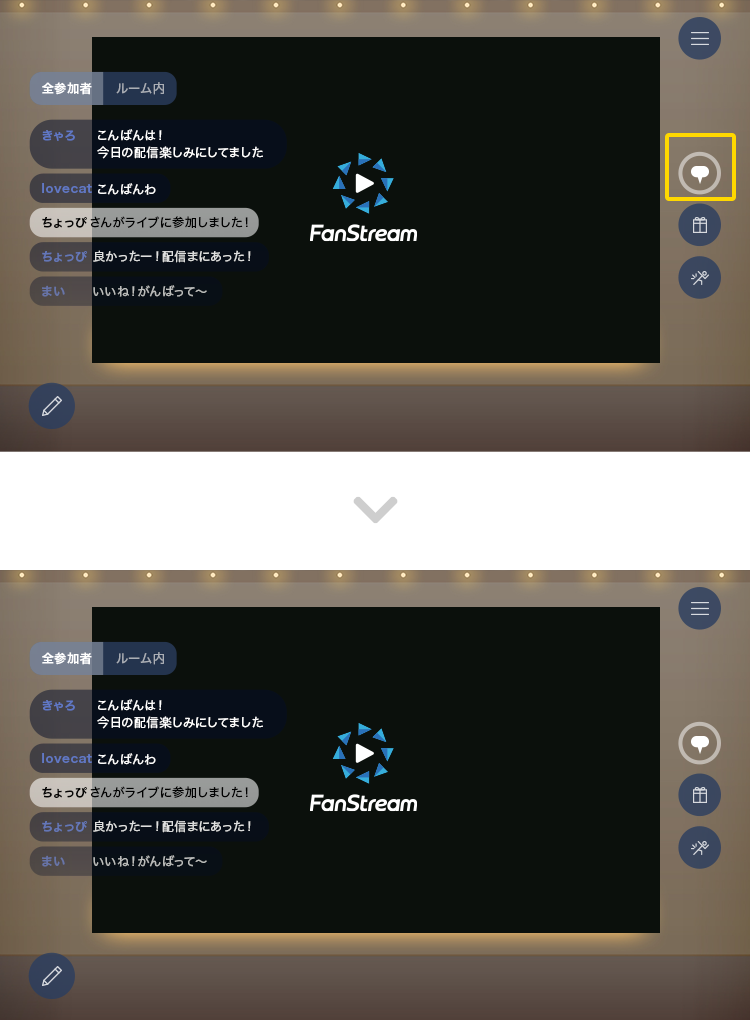 - ・コメントの表示はルーム内のユーザーのコメントのみを表示するか、全ユーザーのコメントを表示するか切替が可能ですが、投稿したコメントはルーム内だけでなく全ユーザーに表示されます。
